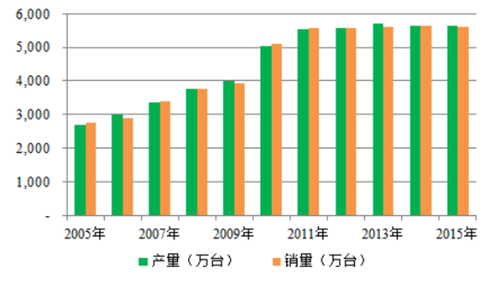 我国洗衣机产业起步较晚,但成长迅速。 2001 年,中国洗衣机产量达到近1,500 万台,跃居世界第一。 2015 年,我国洗衣机产量和销量都超过 5,600 万台,除 2012 年受家电下乡等政策陆续退出、经济增长回落等事件影响,洗衣机销量出现一定程度的下滑外,我国洗衣机产销量呈现良好的发展态势。