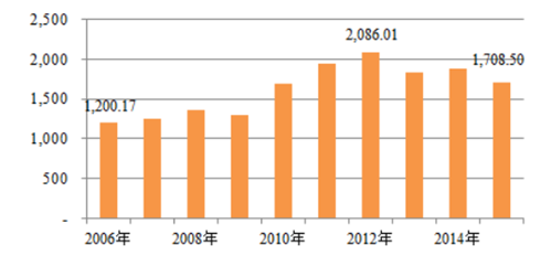 2006 年至 2015 年,我国洗衣机出口量从 1,200.17 万台增长至 1,708.50 万台,年均复合增长率达 4.00%。