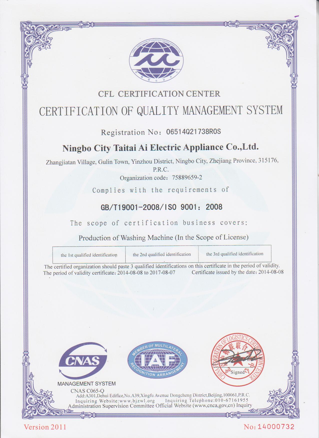 NINGBO TAITAIAI ELECTRIC APPLIANCES CO., LTD.has a superior position, is 7 km away from Ningbo downtown, 3 km away from Ningbo Lishe International Airport, connects to Hangyong Highway in the north, and Yongjin Expressway in the west with convenient transportation. The company was founded in September, 1989, mainly engaged in mould manufacturing early, and started to produce hydro extractor and washer-dryers in 2000. By nearly a decade of steady development, the company has been a professional washing machine manufacturer integrated independent development, manufacturing and selling, and now has three series and 12 varieties of products, with independent brand “Happy Little Angel” and “TTA”. The annual output of the product has reached to 300,000 and the production capacity of the washing machine has reached to 800,000.